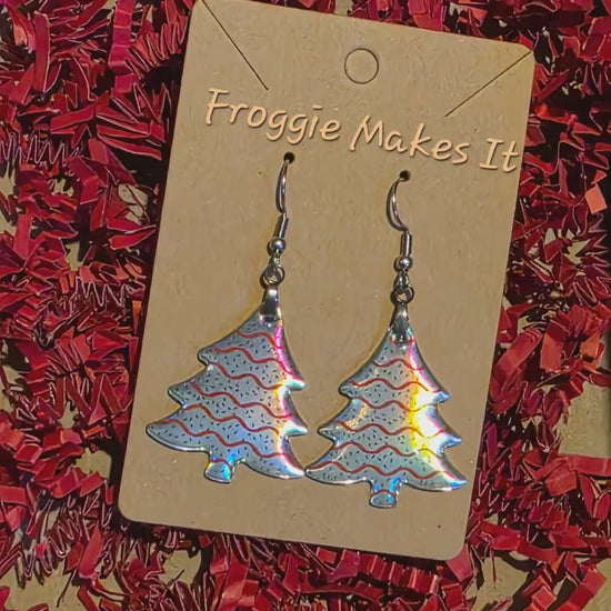 Holographic Christmas earrings bring festive holiday jewelry to life with a unique iridescent dangle design that brightens your holiday sparkle style. These lightweight acrylic earrings, shaped like charming tree cake earrings, are perfect Christmas tree accessories for any holiday party. Crafted from durable acrylic with a holographic finish, these sparkling festive earrings catch the light beautifully and shift colors as you move, making them a standout seasonal festive jewelry piece.