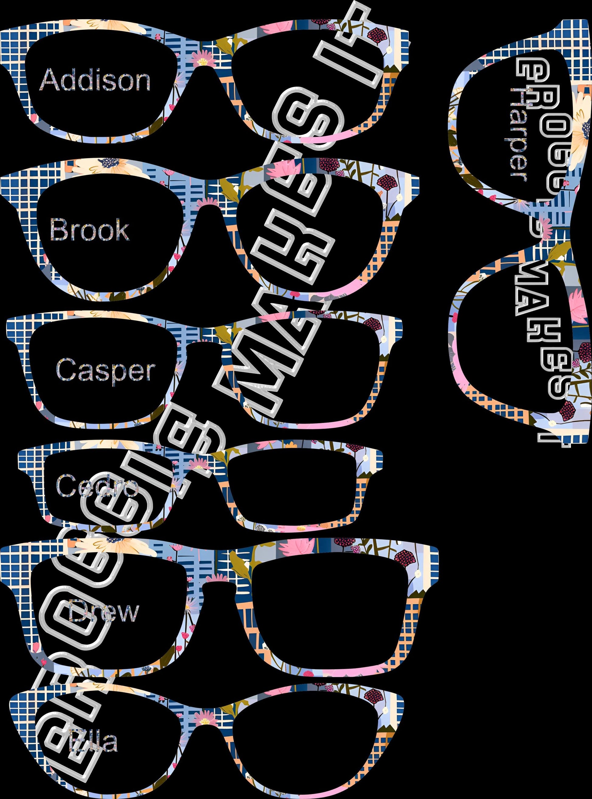 Each topper is crafted with a lightly flexible clear acrylic frame and sealed with resin or UV-resistant vinyl, as selected in the "Personalization" section. Strong magnets are pre-installed to align seamlessly with your Pair Eyewear frame.