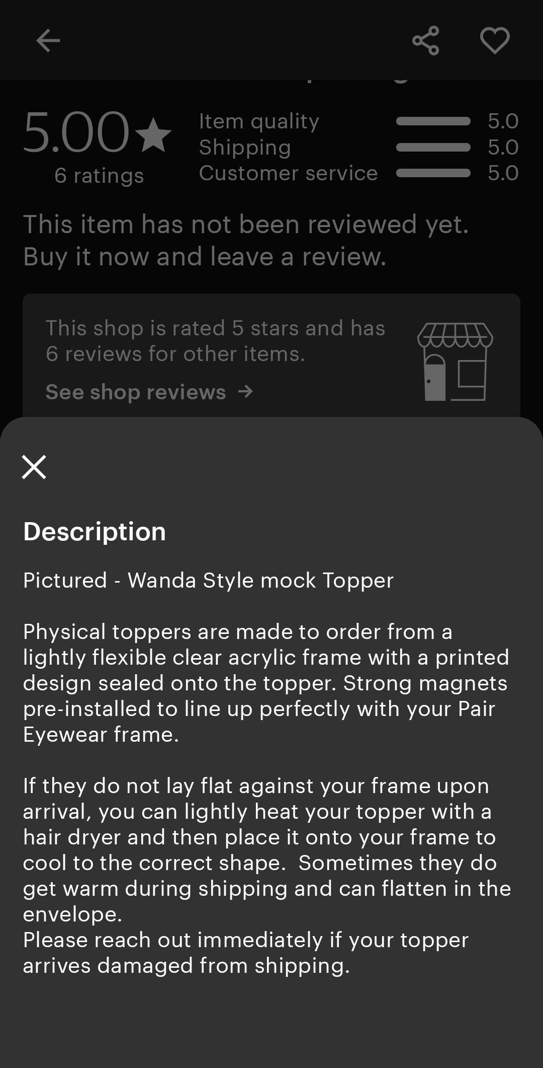 Each topper is crafted with a lightly flexible clear acrylic frame and sealed with resin or UV-resistant vinyl, as selected in the "Personalization" section. Strong magnets are pre-installed to align seamlessly with your Pair Eyewear frame.