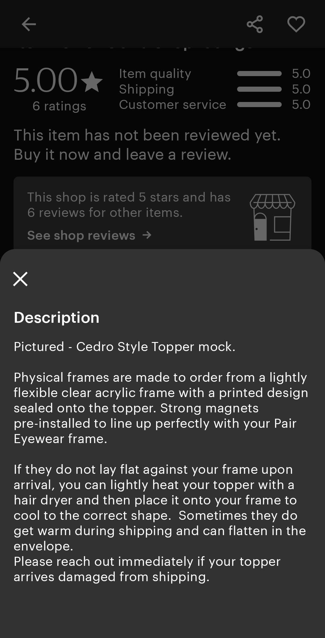Each topper is sealed with a light coat of resin or UV-resistant vinyl, as selected in the "Personalization" section. Strong magnets are pre-installed to align perfectly with your Pair Eyewear frame.